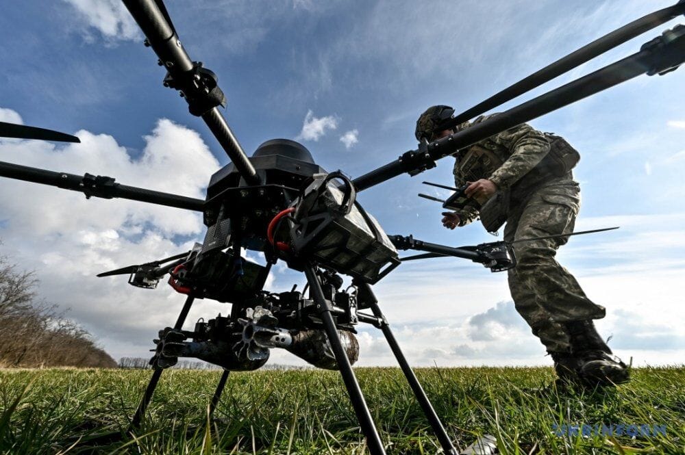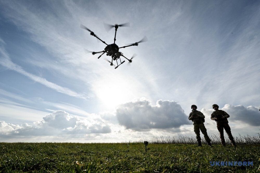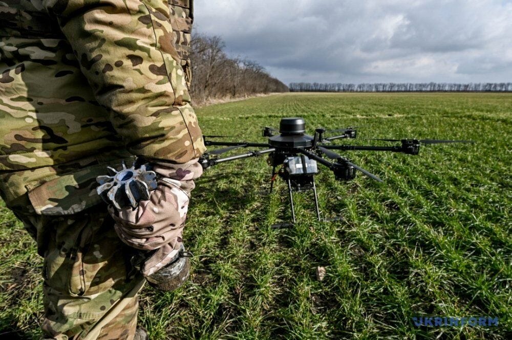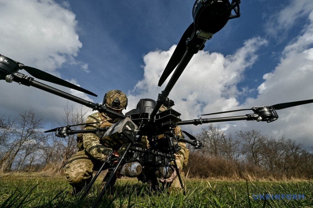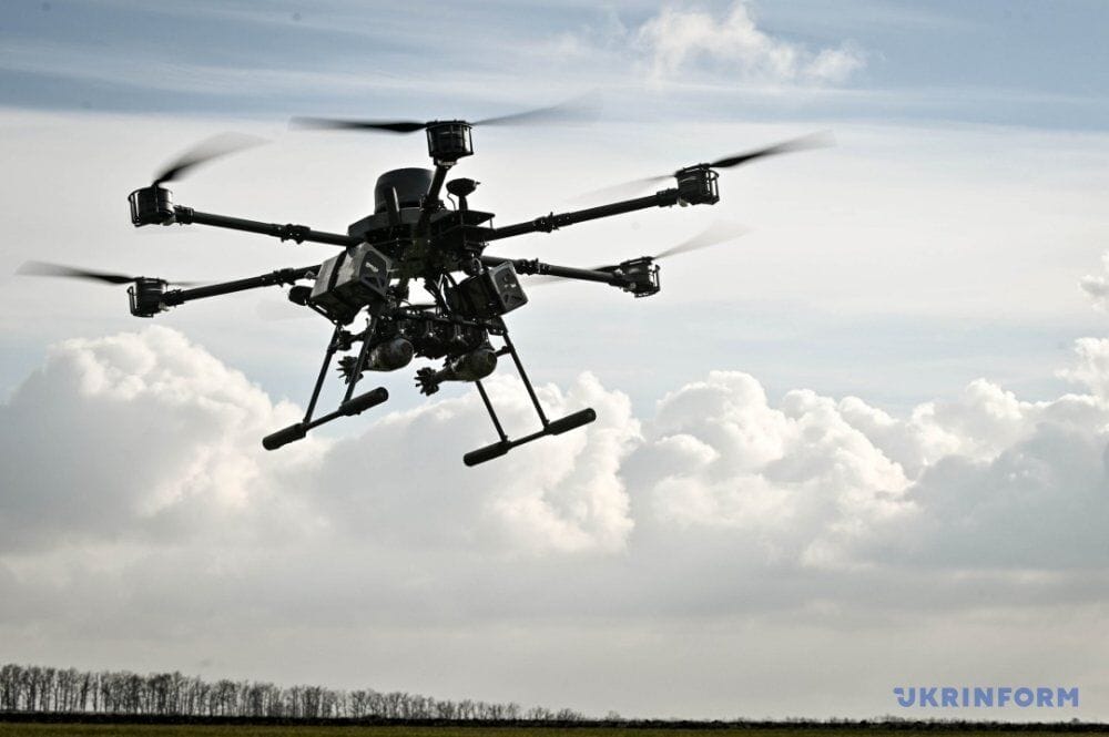 Drone-bomber weighs 50kg can carry up to 15kg of weight. With its help, the military drops mines on the enemy.